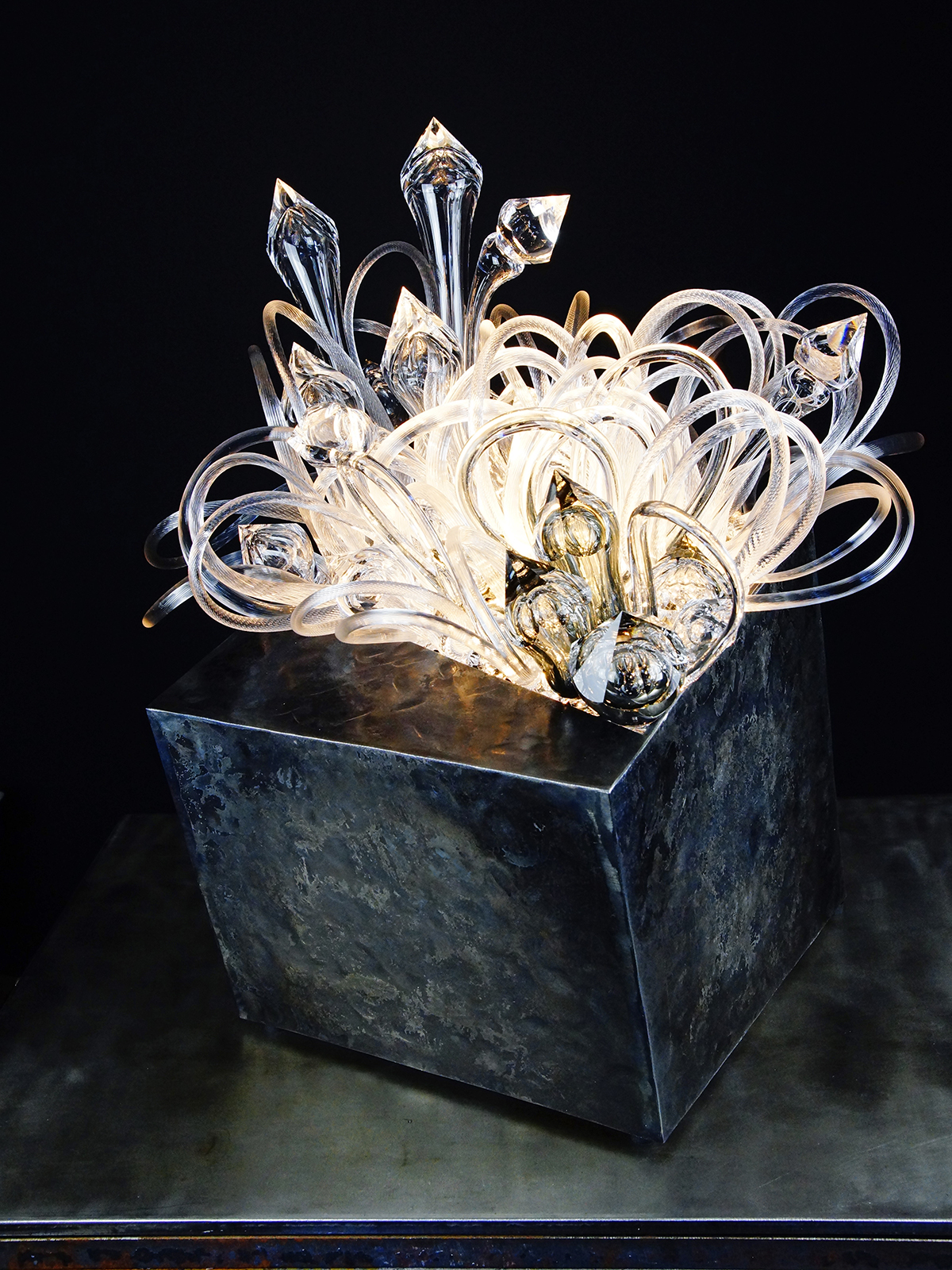 LE VERRE CHAUD EST MON MATERIAU ET MA PASSION. J’UTILISE SES QUALITÉS LIQUIDES AU GLASSFURNACE POUR CRÉER DES FORMULES QUI SEMBLENT ÊTRE CONGELÉES EN MOUVEMENT. JE SOUFFlE BEAUCOUP DE PIÈCES DE VERRE INDIVIDUELLES que j’assemble pour donner vie a NOUVELLE FORME.